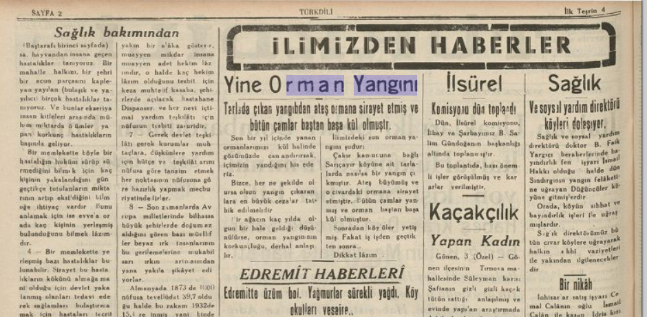 Bu yalnızca günümüzde değil geçmişte de böyleydi. Aşağıdaki Türk Dili gazetesinin 4 Ekim 1935 tarihli sayısından alınan kupür geçmişe dair bir örnek olarak gösterilebilir. Balıkesir’de tarlada başlayan bir yangının ormana sıçrayarak büyümesi haberi bugün de sık sık örneklerini gördüğümüz yangın haberleriyle birebir örtüşmektedir.
