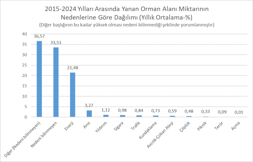 Nedenler açısından zor olan esas kısım ise nedeni saptanamayan ve diğer olarak kategorize edilen yangınlar. İstatistikte diğer başlığının oranının bu kadar yüksek olması istenmez. Oysa yanan her 100 metrekare orman alanının 36,57 metrekaresi diğer başlığındaki yangınlara dayanıyor. O halde diğer dediğimiz nedenler nelerdir? Ve oran neden bu kadar yüksek? Buna bir de nedeni saptanamayan yangınları eklediğimizde oran %70’i geçiyor. Yani, daha açık bir ifadeyle biz aslında yanan her 100 metrekare ormanın 70 metrekaresinin hangi nedenle yandığını tam olarak bilmiyoruz. Nedenini bilmediğiniz sorunu çözemezsiniz. O nedenle, bir an önce yangın kriminolojisi alanında daha kapsamlı çalışmaların yapılması gerektiği net. Bu konuda hem üniversitelere hem de uygulayıcı kuruluşlara sorumluluk düşüyor.