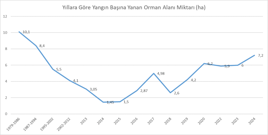 Maalesef evet. Hemen her ölçüt orman yangınları konusunda durumun kötüye gittiğini gösteriyor. Yangın sayısı artıyor. 2024 yılı 3.797 yangınla kayıtlı dönemdeki (1937 ve sonrası) en çok orman yangını çıkan yıl oldu. Yanan alan miktarı da artıyor. Bunlardan daha kötü olanı, yangın başına yanan orman alanı da artıyor. Aşağıdaki grafiğe bakalım [i]: