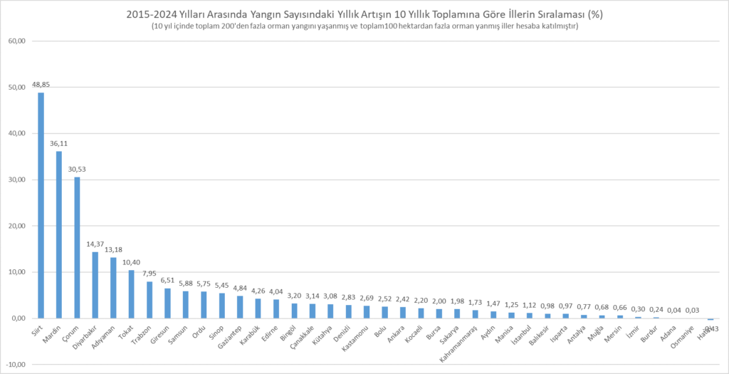 Son yıllarda orman yangınları konusunda adı pek geçmeyen illerde de büyük yangınların görülmeye başlanmış olması doğrudan iklim değişikliğiyle ilişkilendirilebilir. Aşağıdaki grafikte, son 10 yılda yangın sayısındaki artışın toplamına göre illerin sıralaması gösteriliyor [i]. Grafikten de görülebileceği üzere, orman yangınları Akdeniz ve Ege bölgelerine ait bir sorun olmaktan çıkarak tüm ülke sathına yayılıyor.